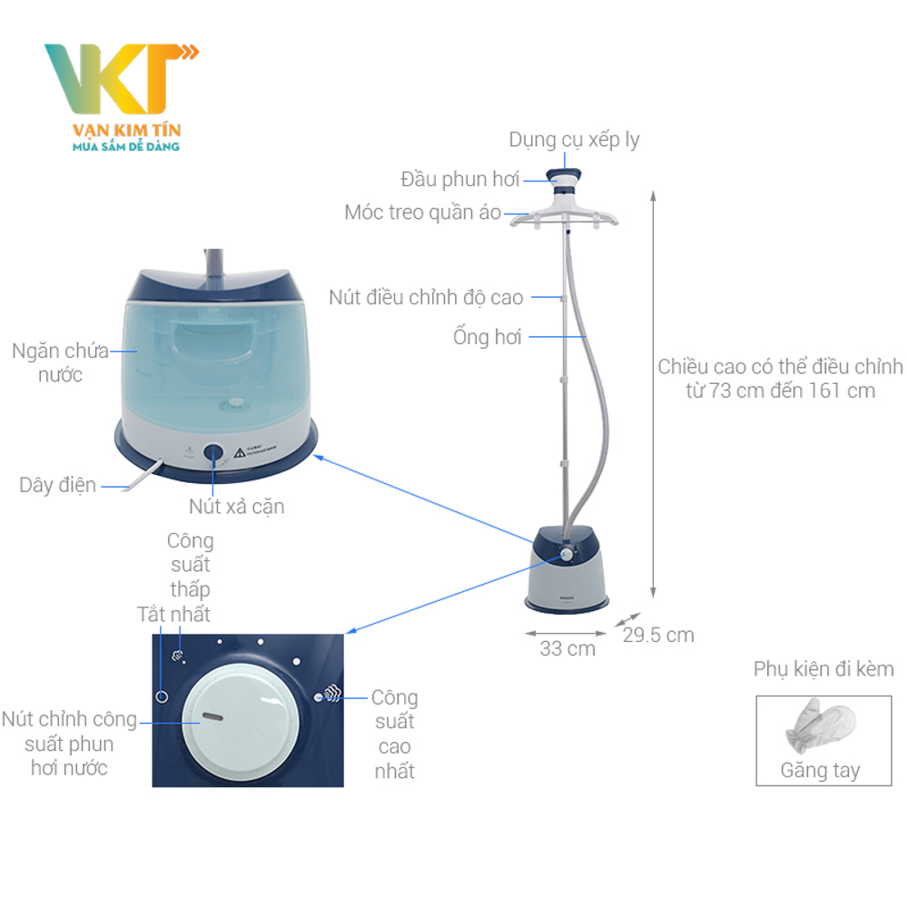Phụ kiện bao gồm găng tay tăng cường cách nhiệt bảo vệ đôi tay bạn trong khi ủi hơi nước, móc treo quần áo đặc biệt.