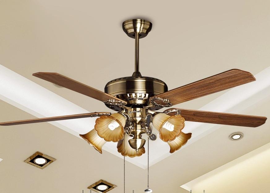 Quạt trần đèn chùm có thiết kế dạng 5 cánh lớn, đường kính từ 1.5m trở xuống, chiều cao từ 50 - 70cm gồm phần quạt và phần đèn chùm.