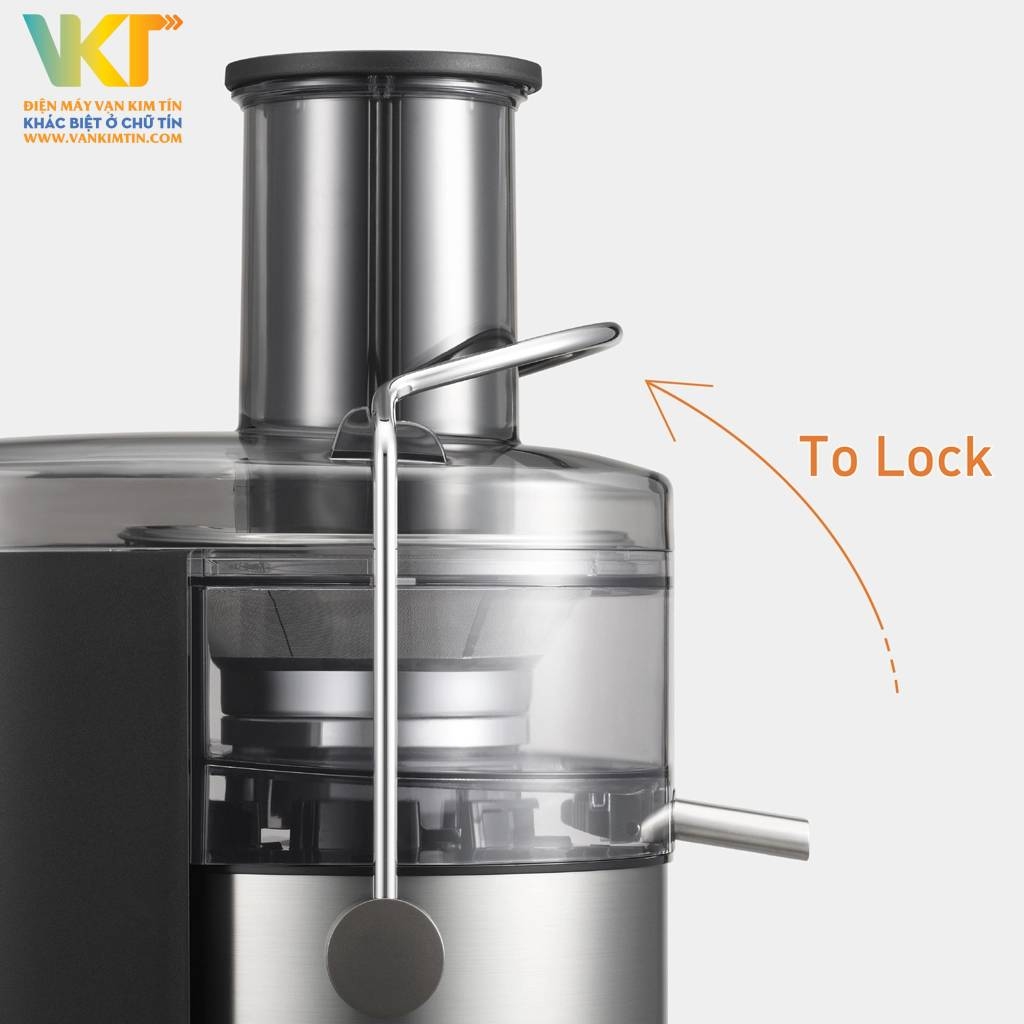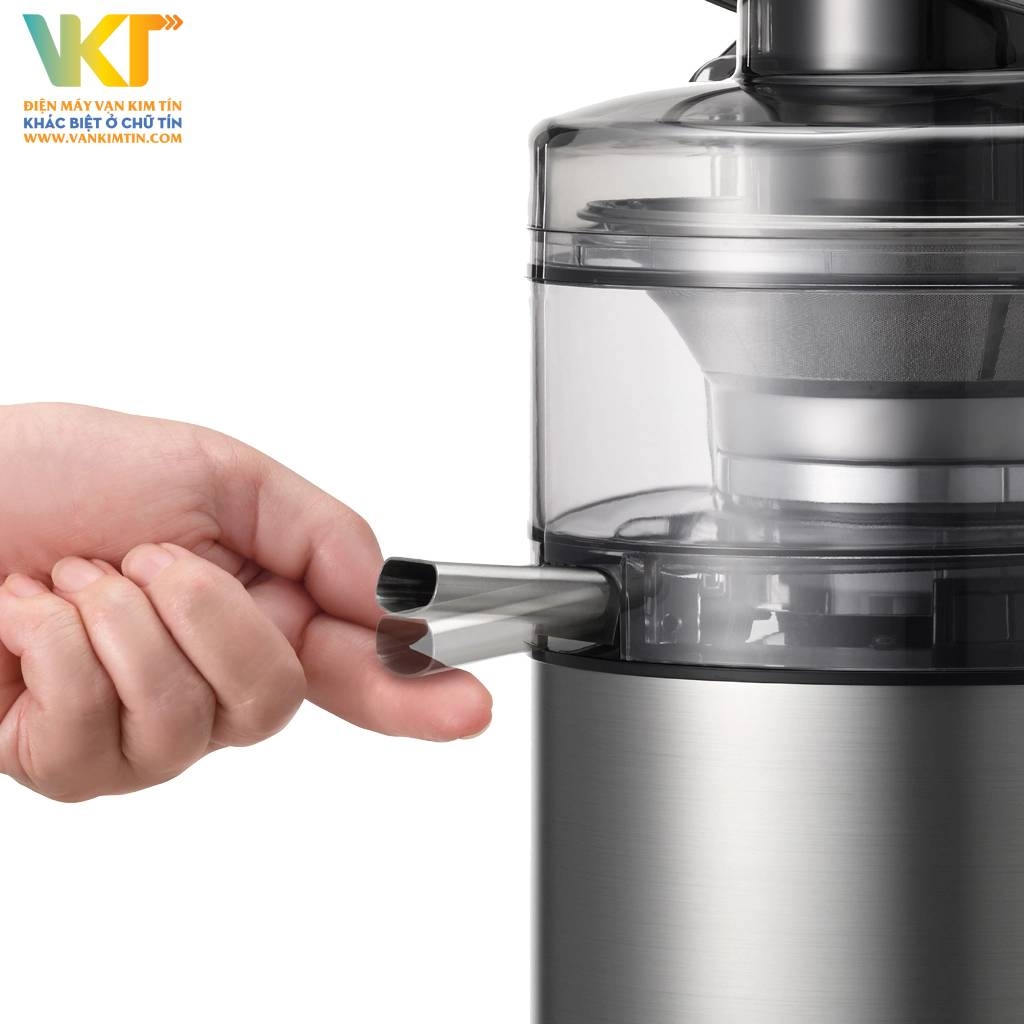Không chỉ đẹp về thẩm mỹ, thiết kế của máy ép trái cây còn hướng tới sự tiện lợi. Ống tiếp nguyên liệu có đường kính 75mm cho phép người dùng ép nguyên trái các loại trái cây cỡ vừa như táo hoặc cà chua mà không cần cắt nhỏ, tiết kiệm thời gian chuẩn bị. Bên cạnh đó, vòi chống nhỏ giọt giúp giữ cho khu vực chế biến luôn sạch sẽ, hạn chế tối đa việc nước ép bị rơi rớt.