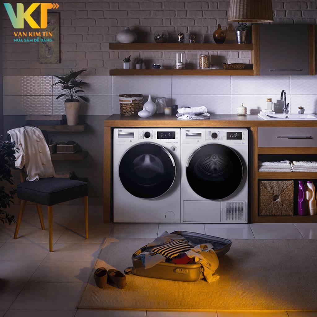 Máy giặt Beko có kích thước nhỏ gọn với thiết kế dạng máy cửa trước - lồng ngang hiện đại, tông màu xám sang trọng, tạo điểm nhấn cho không gian sống của gia đình.