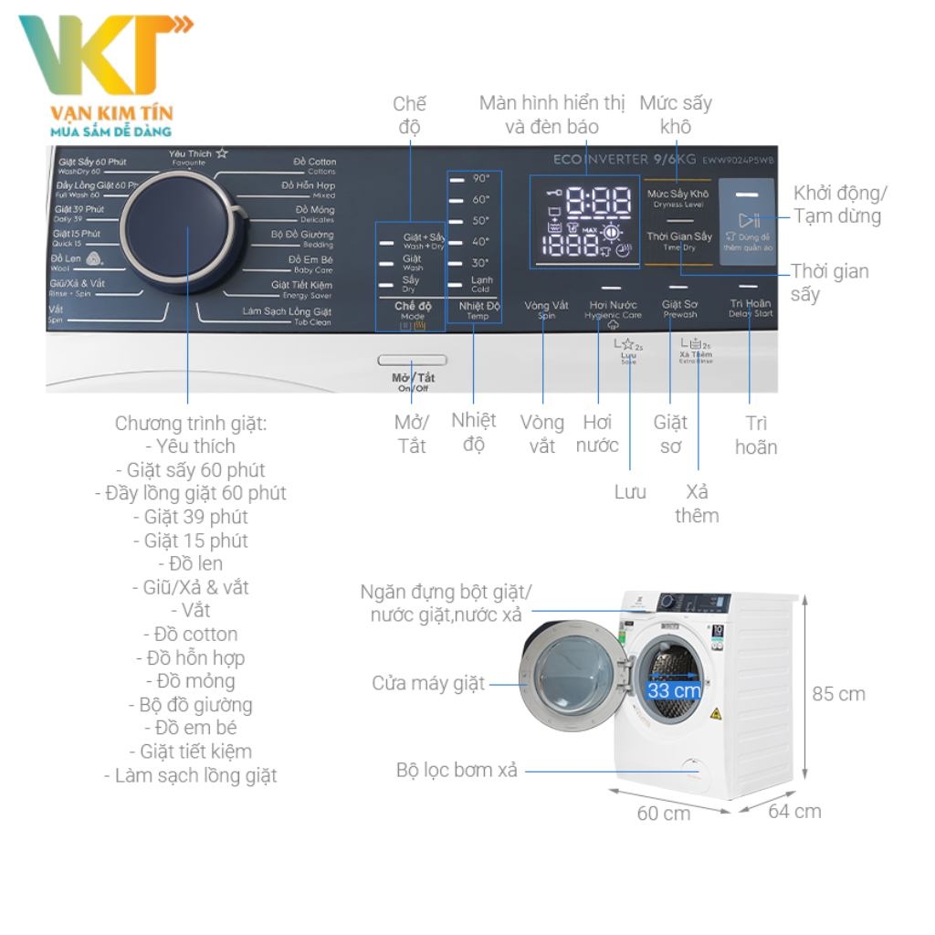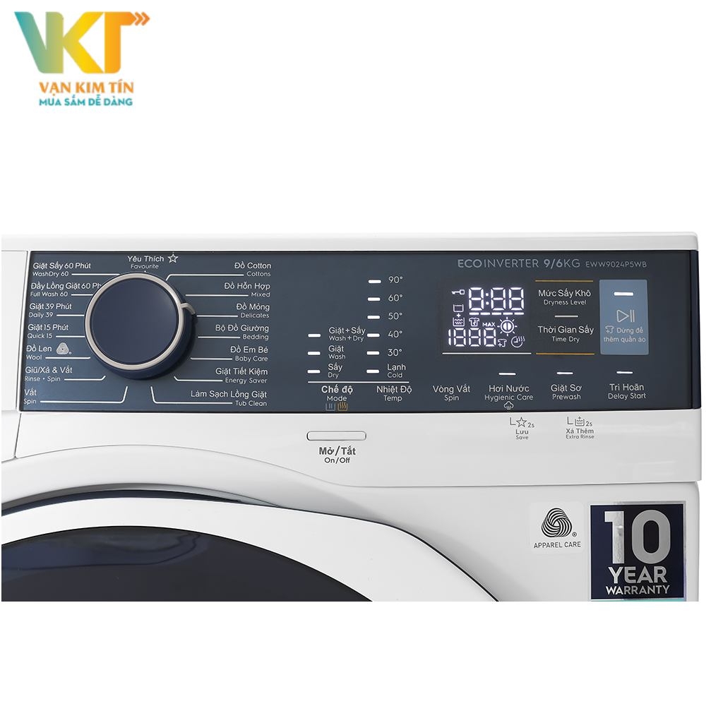 Máy giặt sấy Electrolux Inverter 9 kg EWW9024P5WB là lựa chọn lý tưởng cho gia đình có từ 3 - 5 thành viên với khối lượng giặt 9 kg đi kèm chức năng sấy khô 6 kg giúp sấy khô quần áo nhanh chóng, yên tâm hơn trong mọi thời tiết. Máy được trang bị nhiều tính năng thông minh, hiện đại như công nghệ Hygienic Care diệt khuẩn đến 99.9% và loại bỏ tác nhân gây dị ứng, công nghệ Inverter tiết kiệm điện, chức năng Add Clothes - thêm quần áo khi giặt, hẹn giờ giặt xong, khóa trẻ em,... đảm bảo đem đến cho bạn những trải nghiệm mới mẻ và tiện lợi.