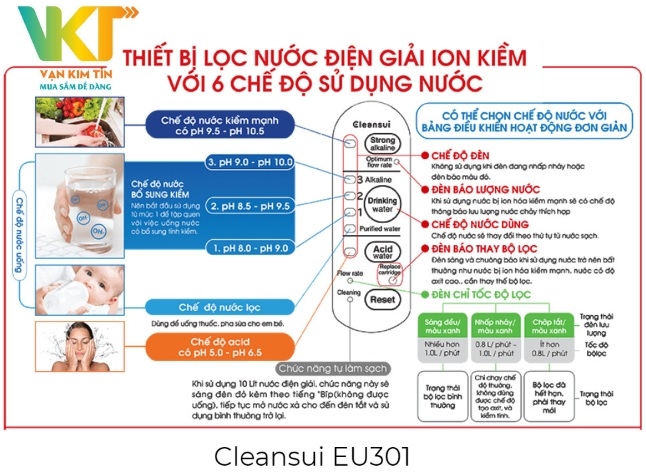 Máy lọc nước ion kiềm Mitsubishi Cleansui EU301 có khả năng tạo ra 6 loại nước chức năng phục vụ đa dạng nhu cầu sử dụng:
