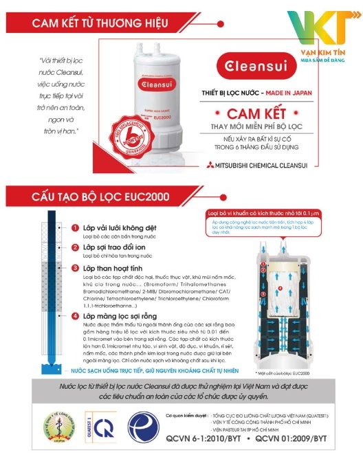 Với những nghiên cứu để tạo ra nguồn nước sạch cho người dùng tại Nhật Bản. Công nghệ màng lọc tiên tiến này cũng được áp dụng cho Máy lọc nước ion kiềm Mitsubishi Cleansui EU301, đảm bảo máy có thể tạo nguồn nước đầu ra an toàn, với một tiêu chuẩn chất lượng cao, đạt chuẩn nước uống tươi tại vòi. Cụ thể, bộ lọc UZC2000E của máy có 4 tầng lọc khác nhau, được mô tả cụ thể như sau: