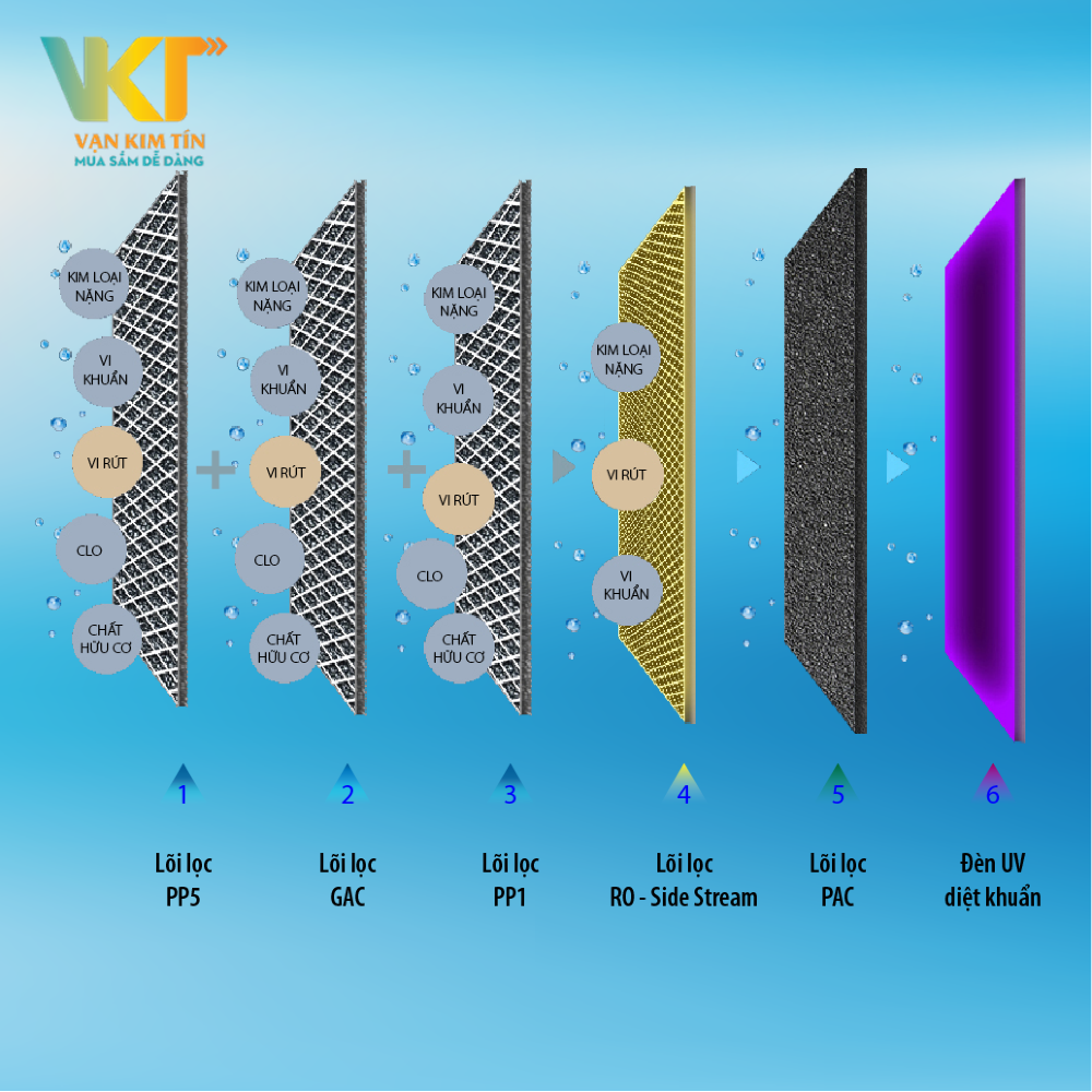 - Bước 6: qua đèn UV nước tinh khiết nước tinh khiết sẽ được diệt vi khuẩn, virus, nấm mốc, các vi sinh vật gây bệnh...