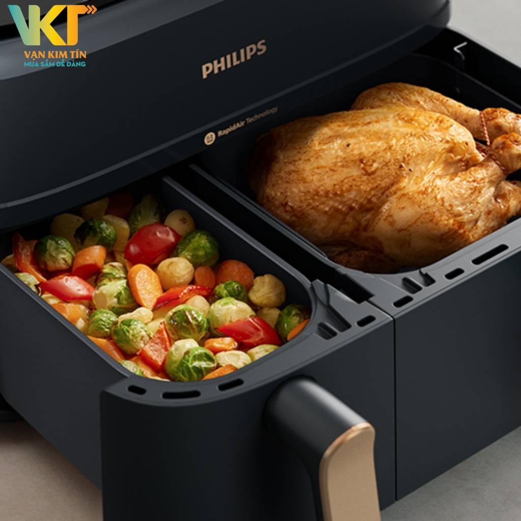 Nồi chiên không dầu nhỏ gọn, màu xám than và đồng đẹp mắt, kích cỡ nhỏ gọn, đặt gọn gàng trên bàn ăn và không chiếm quá nhiều diện tích căn bếp. Nồi chiên không dầu Philips hai giỏ NA352/00 sở hữu dung tích lớn lên đến 9 lít, được thiết kế với 2 ngăn có kích cỡ khác nhau. Ngăn lớn thích hợp dùng để chiên nướng các thực phẩm có kích thước lớn hoặc số lượng nhiều như thịt gà, thịt heo, khoai tây chiên,... Còn ngăn nhỏ hơn thì dùng cho các món ăn kèm hoặc rau củ.