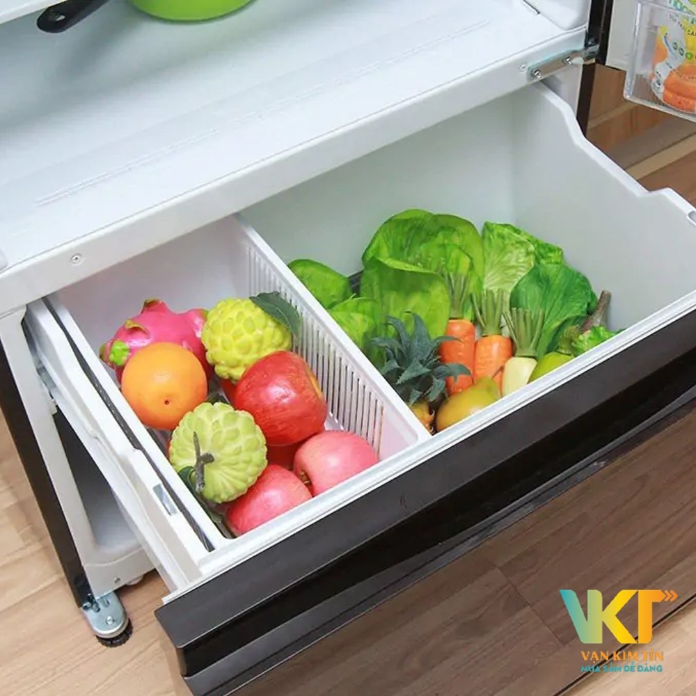 Ngăn rau quả với dung tích lớn được thiết kế độc lập, đảm bảo duy trì môi trường tối ưu cho rau củ quả với nhiệt độ và độ ẩm thích hợp nhất. Ngăn kéo dạng trượt có con lăn trợ lực (với bạc đạn thép không gỉ) giúp khay chứa được kéo mở nhẹ nhàng dù chứa đầy thực phẩm. Bên trong được chia làm 2 khay riêng biệt giúp dễ dàng phân loại và tìm kiếm thực phẩm.