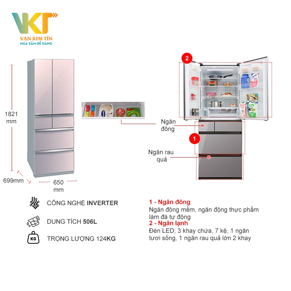 Tủ lạnh Mitsubishi MR-WX52D sở hữu không gian lưu trữ thực phẩm cực kì rộng rãi và tiện nghi. Ngăn ướp lạnh mềm giúp bảo quản ở nhiệt độ -3°C đến 0°C mà không làm đóng băng thực phẩm. Ngoài ra, còn có ngăn cấp đông mềm 30 lít tiện dụng, ngăn làm đá tự động 22L, ngăn lạnh 271L, ngăn rau quả 96L và ngăn đông 87L.